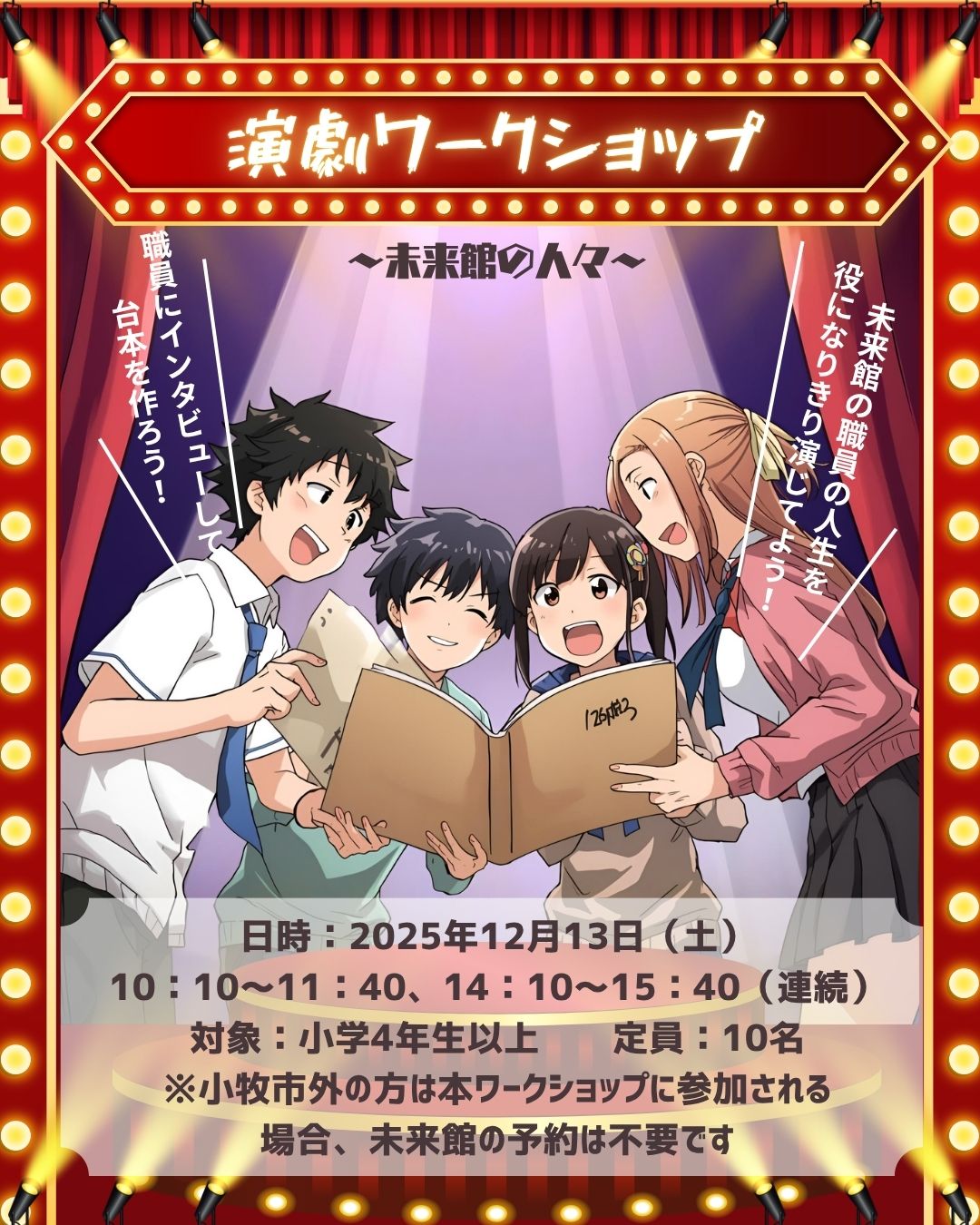 身近な人をインタビューして作った台本をみんなで演じてみよう! 今回のテーマは「未来館職員」!どんな子供時代だった? おもしろエピソードは?楽しい舞台を完成させよう!!