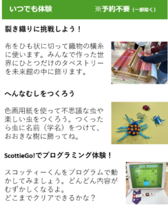体験ひろばでは、アナログからデジタルまで、 いろんな体験ができる場所を目指しています。 ぜひ遊びにきてください!